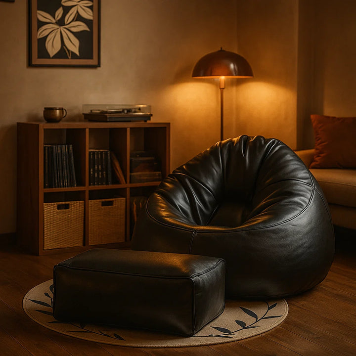 Experience elegance and unmatched comfort with The Windsor Leatherette Bean Bag with Ottoman by Tick Bags. Designed to bring a touch of sophistication to your living space, this premium bean bag is crafted from high-quality leatherette, offering the luxurious look of leather with added durability and easy maintenance.